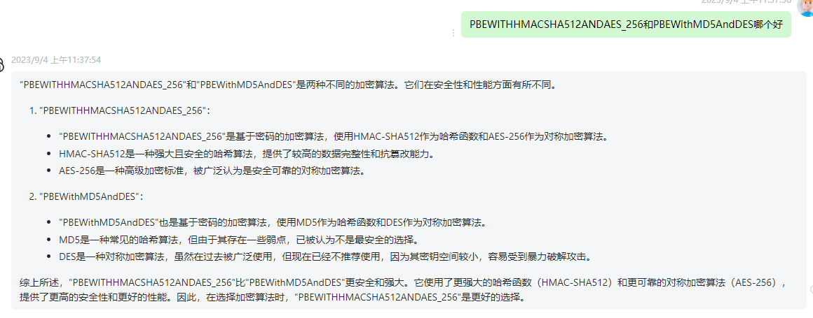 两种密码加密的方式还是有区别的,如果追求高安全性和性能,推荐使用PBEWITHHMACSHA512ANDAES_256