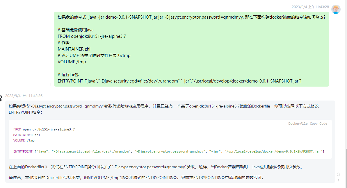 #方式1: java -jar xxx.jar -Djasypt.encryptor.password=qnmdmyy #方式2: java -jar xxx.jar --jasypt.encryptor.password=qnmdmyy既然使用指令配置秘钥,那么在docker构建项目镜像的时候就需要对以下原命令进行相应的修改