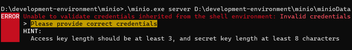 set MINIO_ACCESS_KEY=minioadmin最少三位